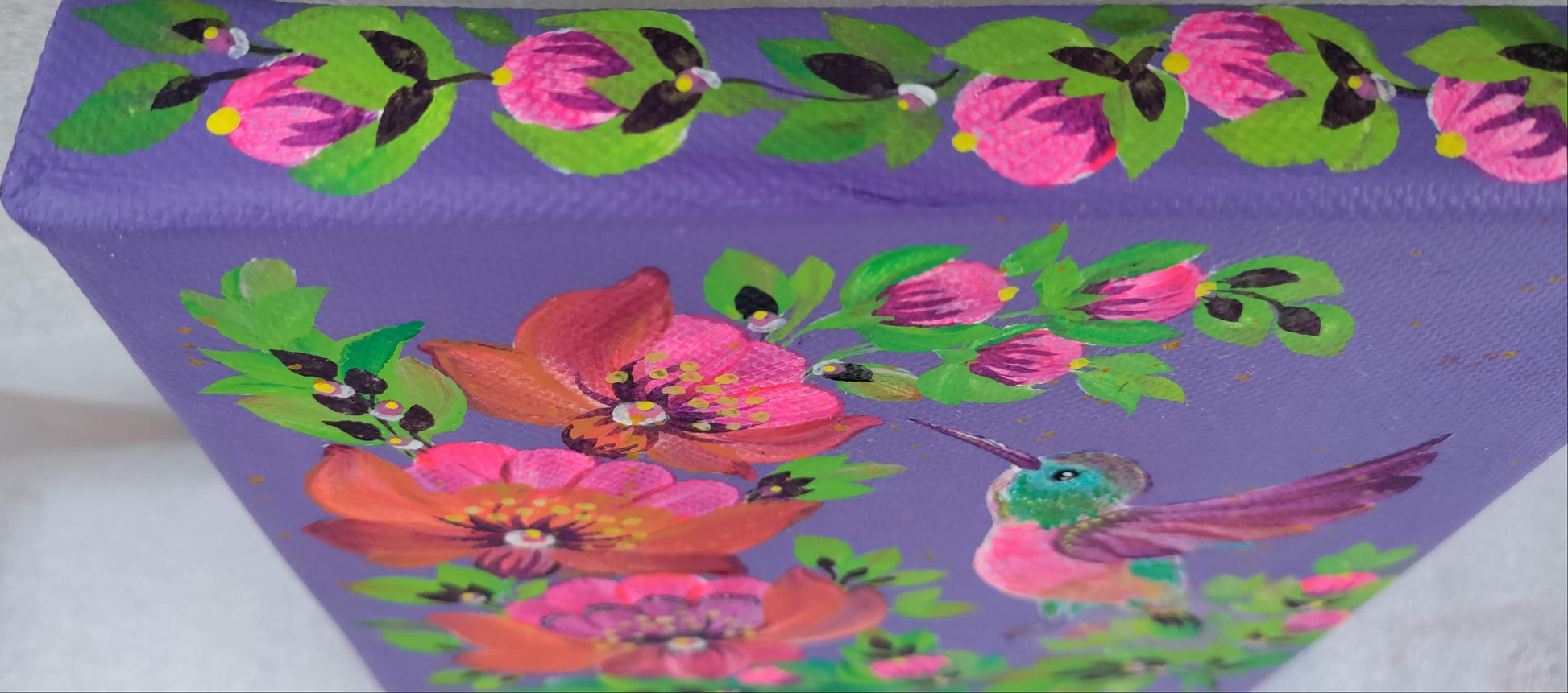 Painted in Petrykivka style on 6"x6"X.75"canvas using acrylics. Light ornamental painting on all sides of the canvas. . You can hang the canvas, you could keep on a shelf, but you will we be greeted by flowers no matter where you are.