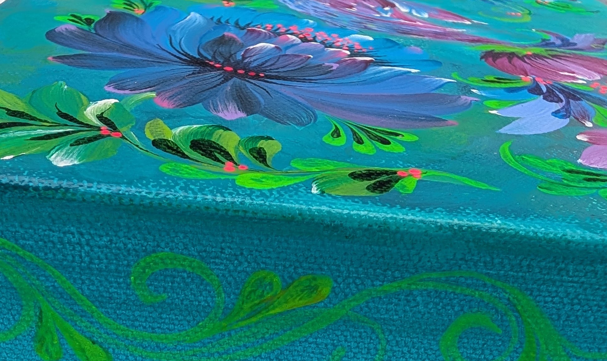 Painted in Ukrainian folk art style Petrykivka using so-flat acrylics on background using mixed medias. Ornamental painting on all 4 sides. Varnished.